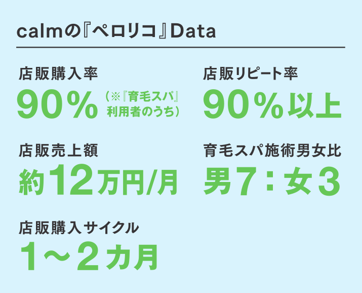 同店ではサロンと自宅の同時ケアを「ペロリコ・ハイブリッドメディカル育毛」と命名し、開始から3カ月ごとに、薄毛が気になる部分をお客さまのスマホで撮影し、変化の過程を可視化している。結果に納得していれば必然的に継続となり、セールストークなしで店販につながる。『ペロリコ』店販リピート率は90%である。
