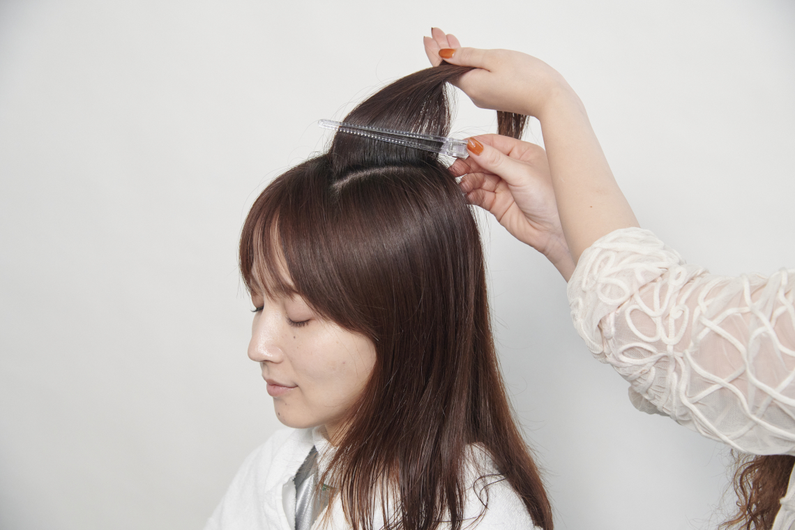 サイドも前上がりスライスを取ってエアタッチ。上下2パネルで施術。塗布幅は、内側が中間~毛先、表面が毛先のみ。