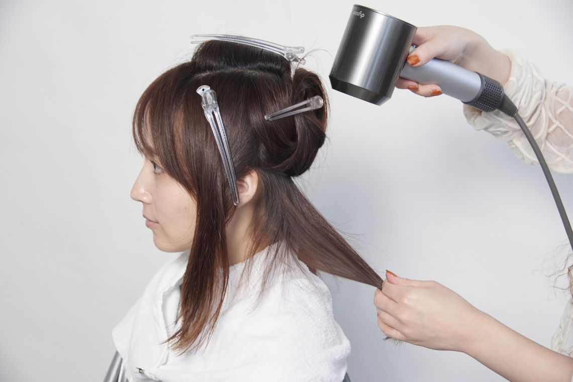 バックアンダーから施術開始。エアタッチでブリーチ施術。45度の前上がりスライスを取り、ドライヤーの風を当てて、短い髪を下に落とす。