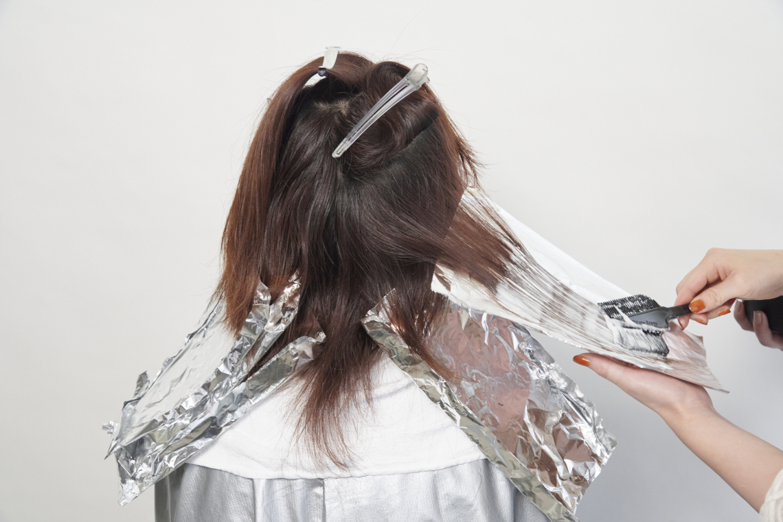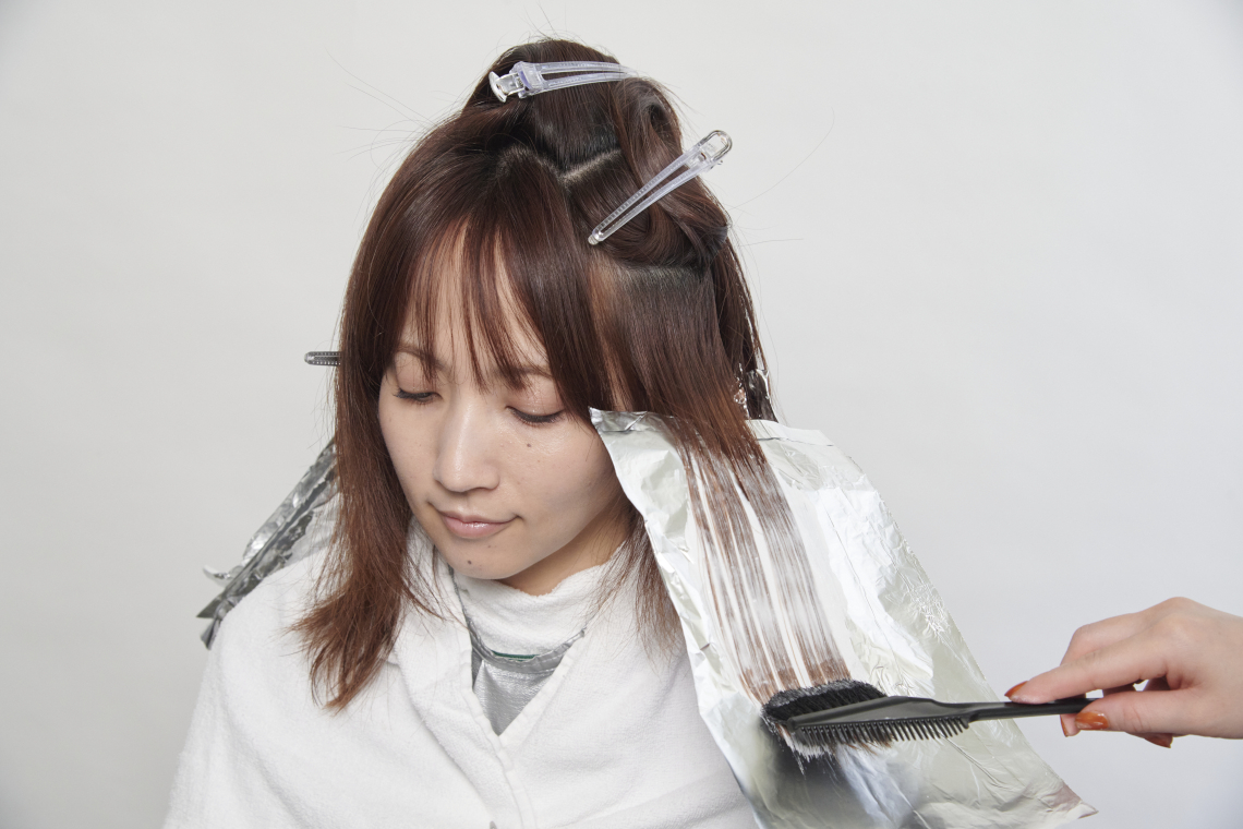 アッシュとベージュを組み合わせたブラウン系のヘアカラー剤【B】を使用し、ベースを塗布。新生部の根元2cmから塗っていく。