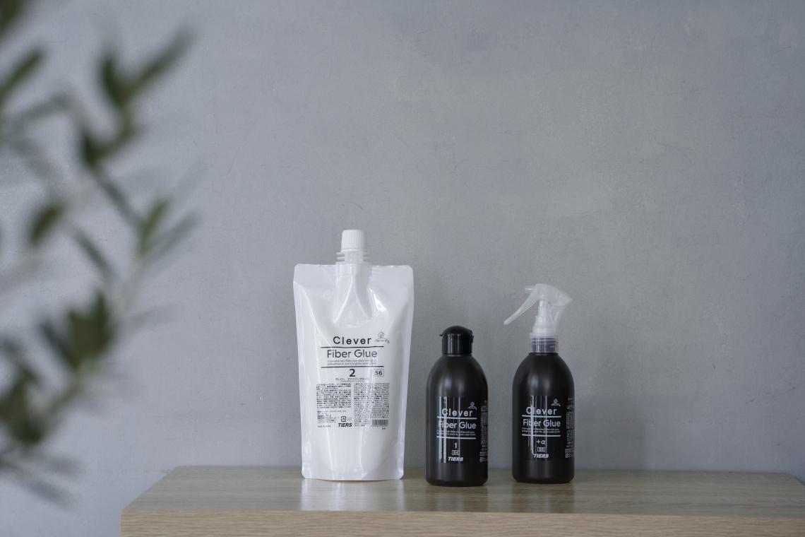 切れ毛を防止し、ツヤ感や髪の強度をアップする処理剤シリーズ。特に、『クレバー ファイバーグルー+α』は、ブリーチ時やハイダメージの毛のヘアカラー施術に使いやすい、スプレー状のケラチン。美しい仕上がりのために欠かせない一品だ。