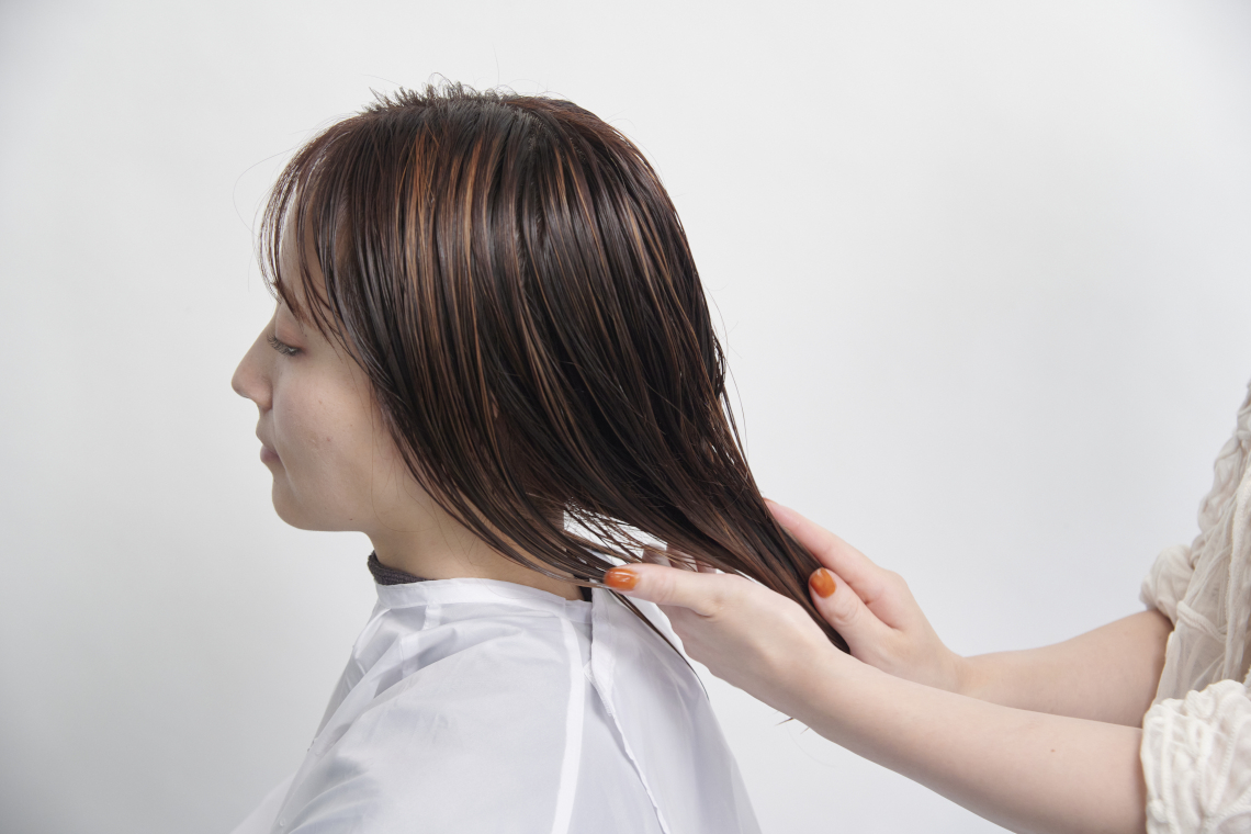 ドライ前に、『クレバー 水素トリートメントシステム4』を手のひらにのばし、毛先中心になじませてツヤ感をつくり出す。