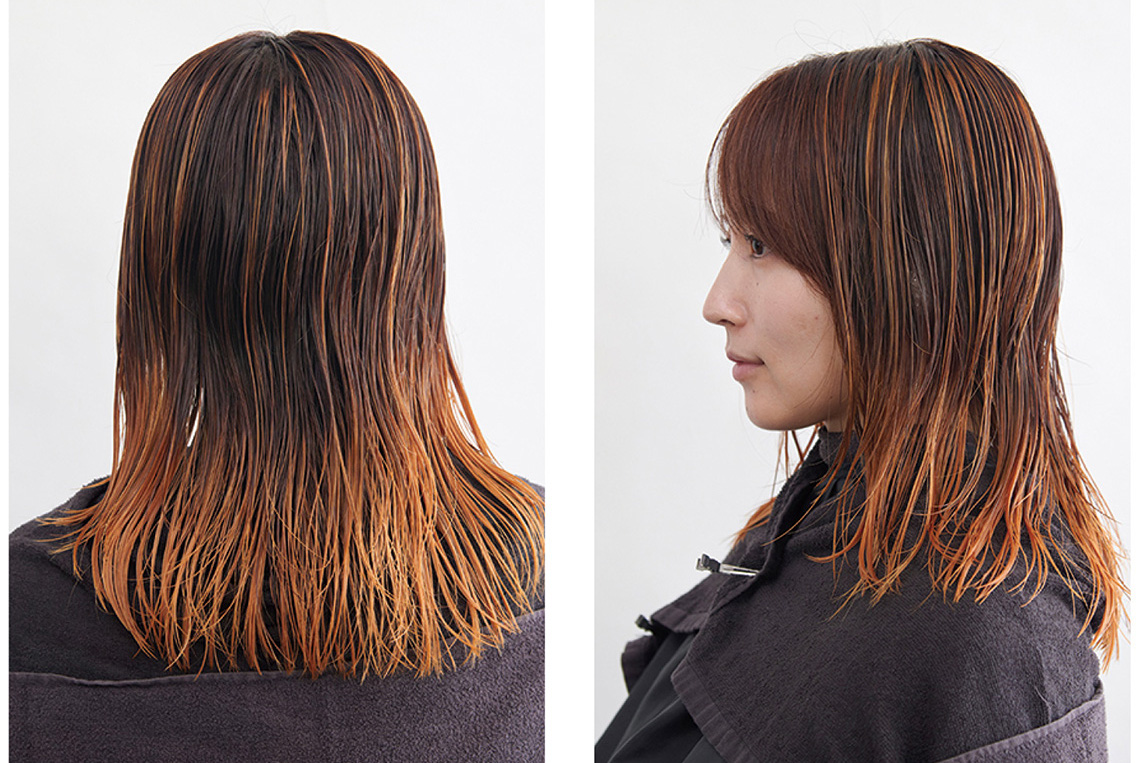 25分放置し、水洗。ブリーチによるバレイヤージュの施術を終えた状態。グラデーション状に広がるハイライトに対し、表面のウイービングがアクセントになっている。